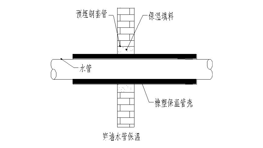在管道穿墙处要事先预埋套管,套管直径应比管道直径大2号,冷冻水管保温层在穿墙体处应不得断开,并应在保温层与套管之间的间隙填充软质保温材料。如图所示: